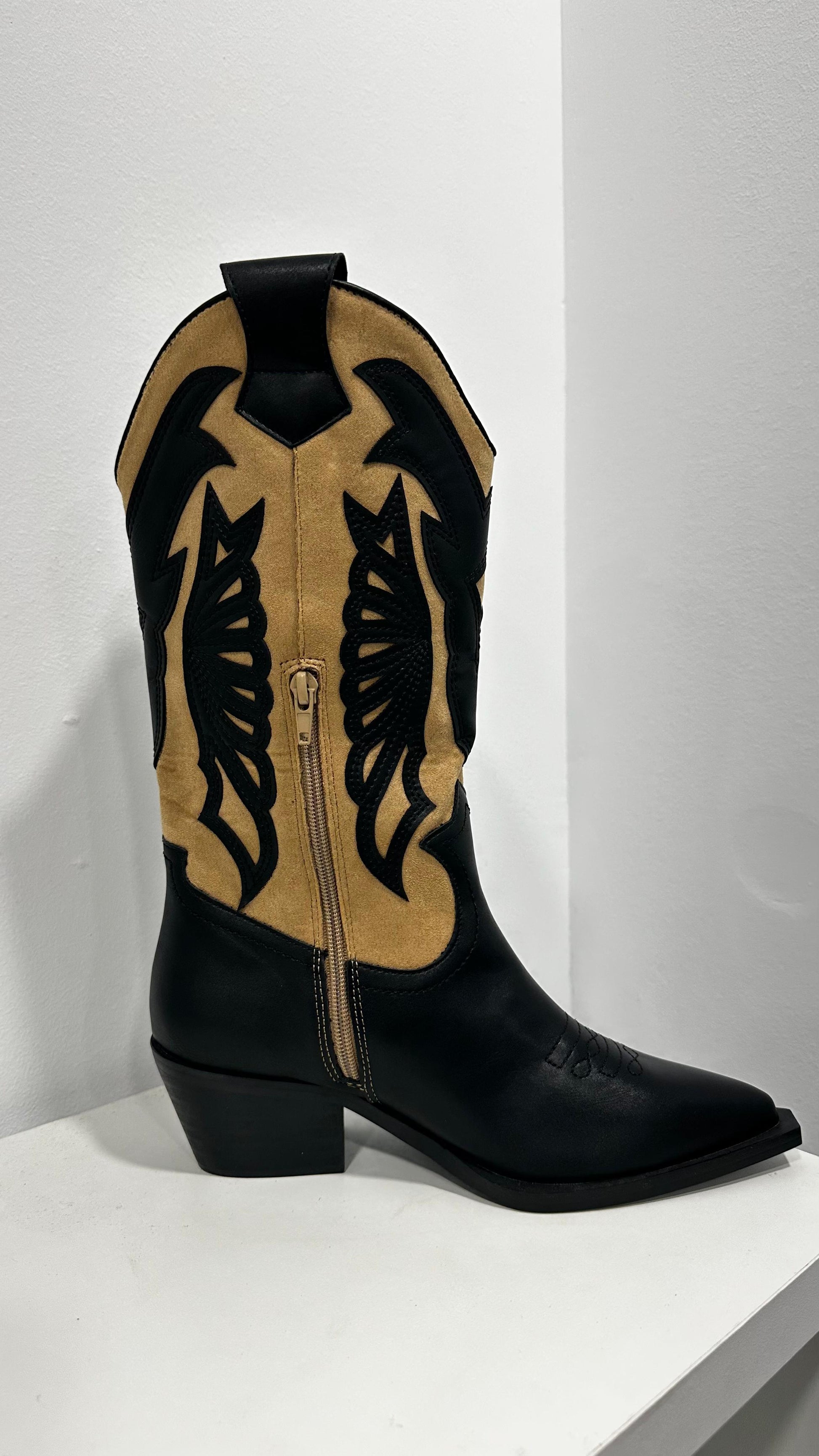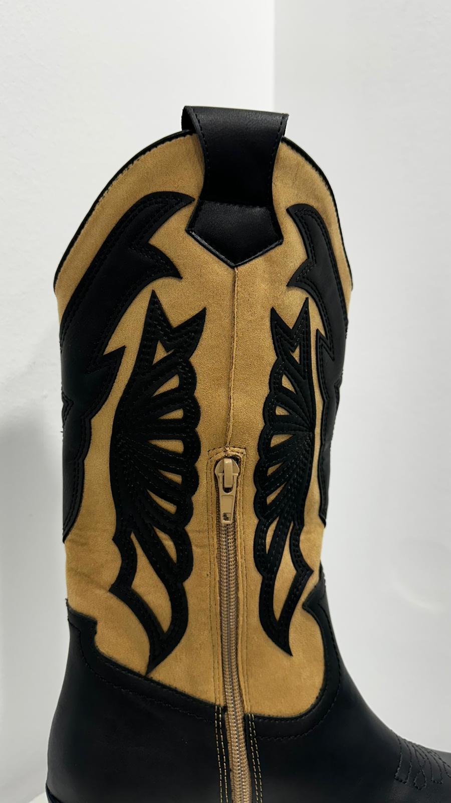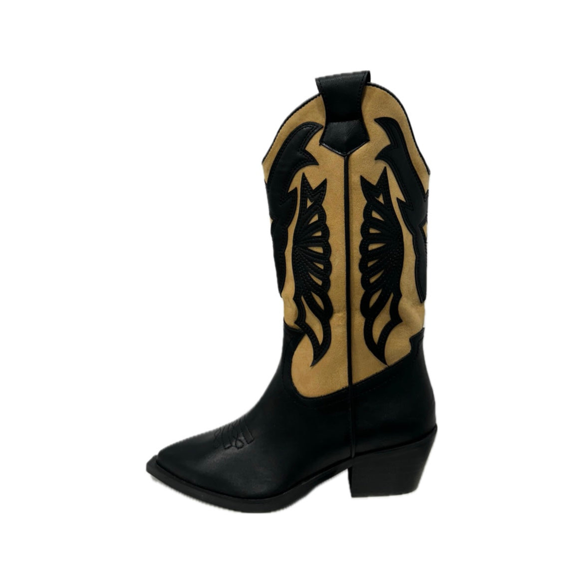 De caña media-alta, estas botas mezclan ante sintético en tono camel claro con detalles en cuero negro que enmarcan su silueta. La punta afilada y el tacón medio aportan altura y estilo, sin perder comodidad ni actitud.