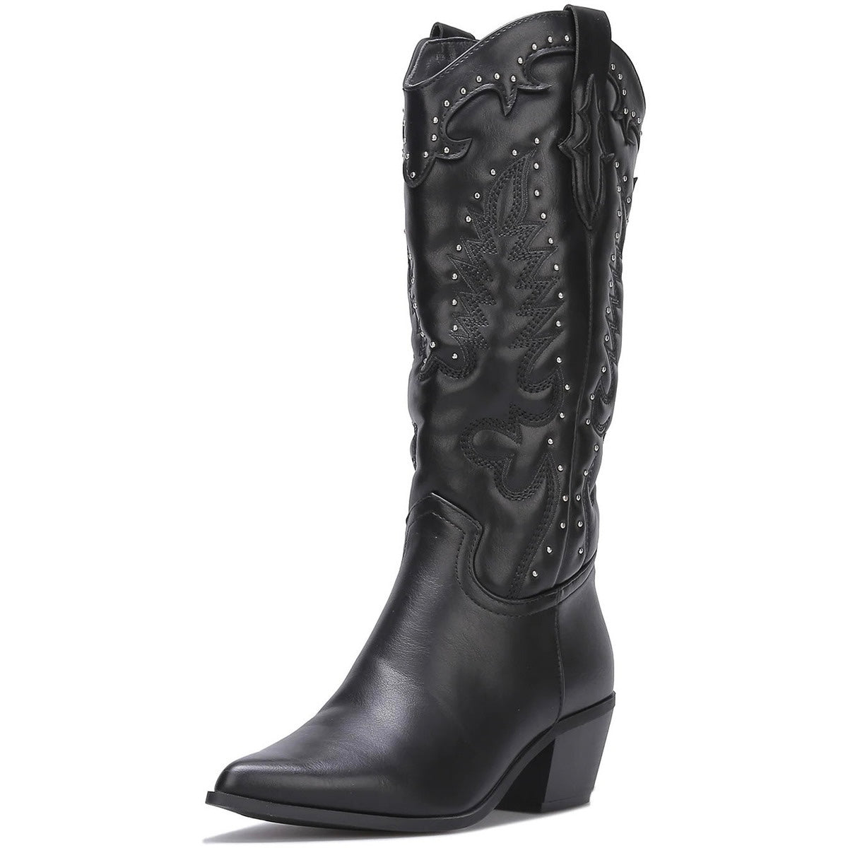 Confeccionadas en piel sintética negra, destacan por sus tachuelas metálicas que recorren el diseño, aportando carácter y una actitud poderosa a cualquier look.