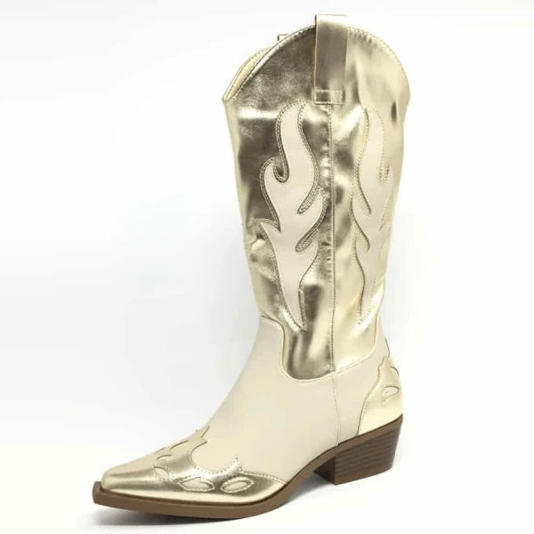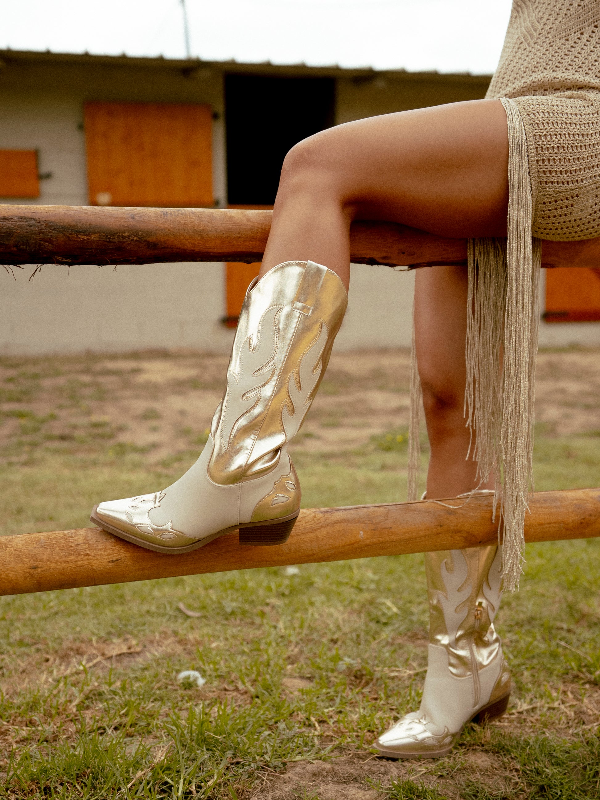 Confeccionadas en piel metalizada dorada, combinan el estilo vaquero clásico con un acabado luminoso que roba miradas.