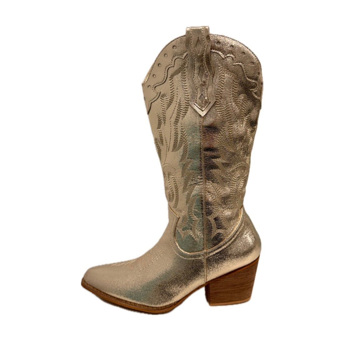 De caña media-alta y completamente cubiertas de acabado dorado brillante, estas botas están hechas para destacar. Su silueta estilizada y el tacón medio aportan altura con comodidad, mientras su diseño luminoso convierte cada paso en una declaración de confianza y poder femenino.