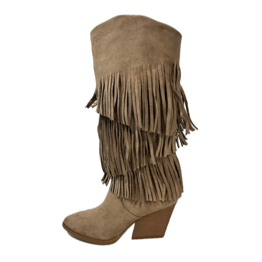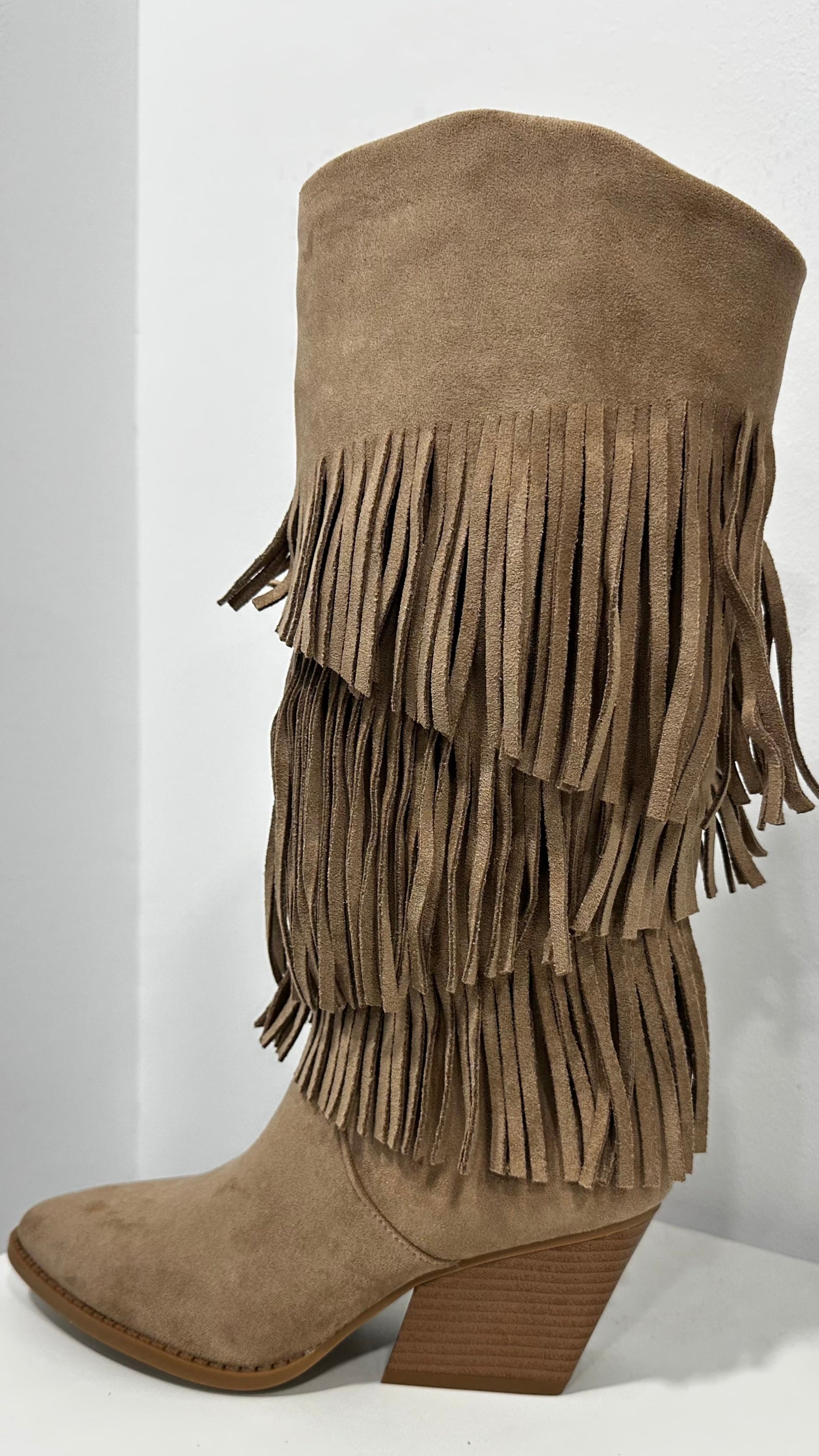 Con su diseño de flecos fluidos y su color beige suave, este modelo captura la esencia del espíritu western más elegante y femenino.