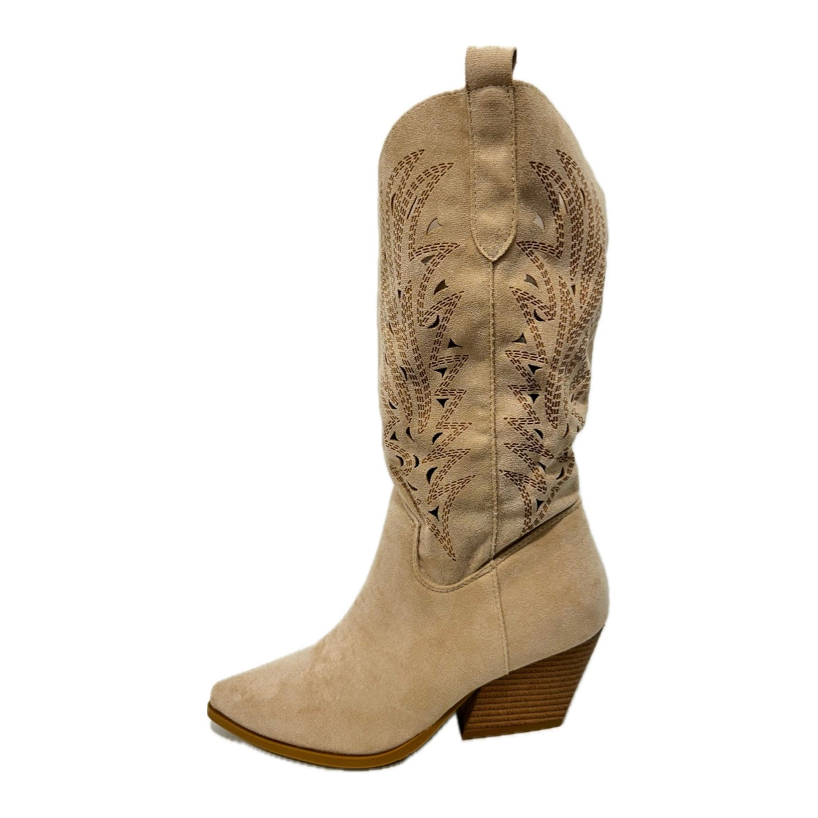 De caña media-alta y tono beige claro, estas botas destacan por sus delicados detalles en marrón y tonos suaves que aportan profundidad y armonía al diseño. Su tacón medio estiliza la figura manteniendo la comodidad, creando una silueta femenina y versátil que combina con todo.